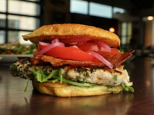 Grilled chicken breast, Prairie Breeze Cheese Spread, Pickled Red Onion, Bacon, Tomato and Arugula on a Classic Potato Roll.